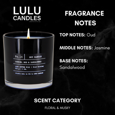Experience the perfect harmony of exotic florals and warm woods with Lulu Candles’ Jasmine, Oud & Sandalwood Candle. Hand-poured in small batches using our premium soy wax blend, this artisan candle delivers a clean, long-lasting burn that fills your space with a calming, spa-like aroma.